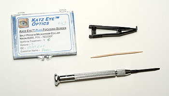 Arrivato il pacco con il prezioso contenuto, non resta che montarlo sulla fotocamera. A qualcuno potrà sembrare complesso dover mettere mano alla propria reflex, ma assicuro fin da ora che la procedura è di estrema semplicità, almeno per il modello Nikon D200 che ho testato. Tuttavia, se qualcuno non se la sentisse di farlo lo stesso, Katzeye offre un servizio di montaggio per 50 dollari aggiuntivi, più il costo della spedizione della fotocamera. Questo servizio comprende, oltre il montaggio, anche l'allineamento del vetrino di messa a fuoco con i riferimenti nel mirino, il controllo della calibrazione della messa a fuoco manuale e la completa pulizia del box specchio e dell'area dello schermo di messa a fuoco. Non viene invece pulito il sensore, il pentaprisma o modificata la calibrazione del sistema di messa a fuoco automatica.