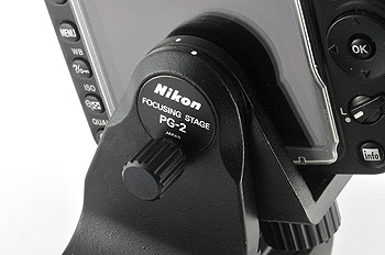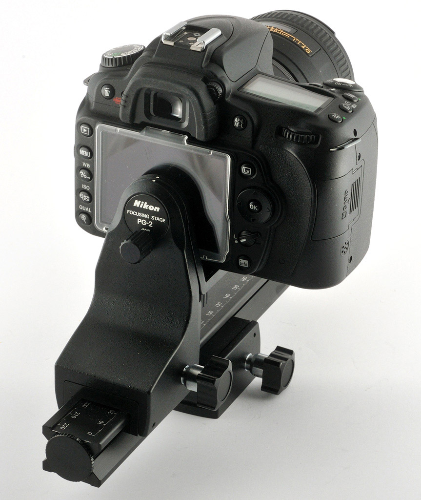 A differenza delle normali riprese fotografiche, in cui è la fotocamera a modificare il fuoco in base alla posizione del soggetto rispetto al fotografo, in macrofotografia è più conveniente modificare la posizione della macchina finché il soggetto risulta perfettamente a fuoco. Ciò ha il vantaggio di poter impostare un preciso rapporto d'ingrandimento e non variarlo nel tentativo di mettere a fuoco modificando la distanza obiettivo/sensore. Operando su treppiede questa operazione non è molto pratica da eseguire. Nikon dispone del supporto per messa a fuoco PG-2, composto da una rotaia di 20cm su cui si può spostare liberamente un carrello su cui viene applicata la reflex.