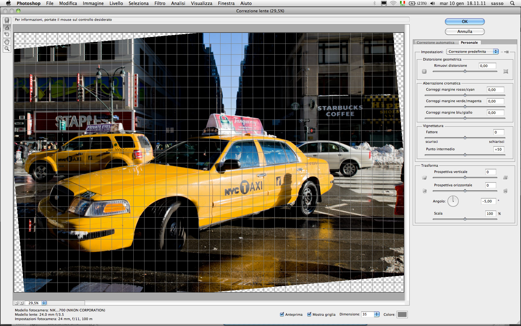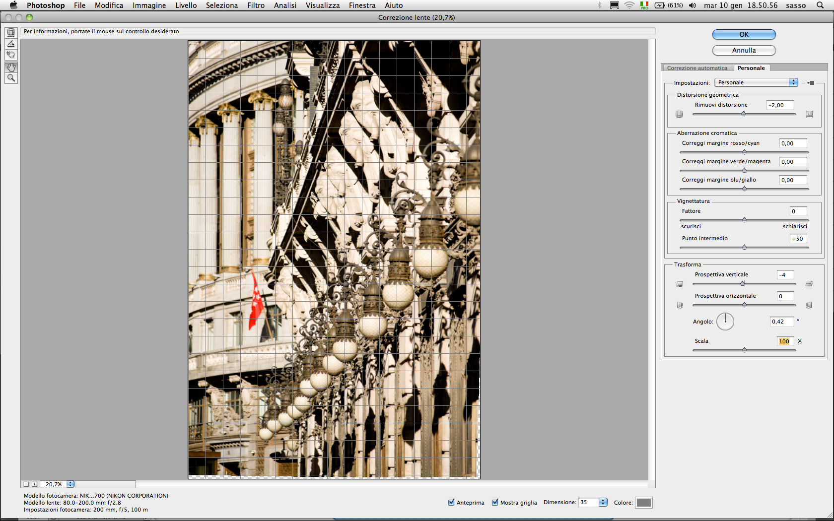 Il primo dei due strumenti a disposizione, il filtro Correzione Lente, è estremamente potente e non si limita a correggere la prospettiva, sia in senso verticale che in senso orizzontale, ma interviene anche sulla distorsione, sulla rotazione dell'immagine, sulle aberrazioni cromatiche e sulla vignettatura. Su scatti RAW/NEF gli aspetti di controllo di aberrazioni cromatiche, vignettatura e distorsioni geometriche di lenti diverse dai Tilt & Shift Nikkor PC-E, si potrà anche operare in Capture NX2 come descritto nell’eXperience Nikon Capture NX 2: ottimizzare le prestazione degli obiettivi, o con altri software specializzati tipo DxO Optics Pro per proseguire sul file TIFF 16bit con le correzioni prospettiche in Photoshop.