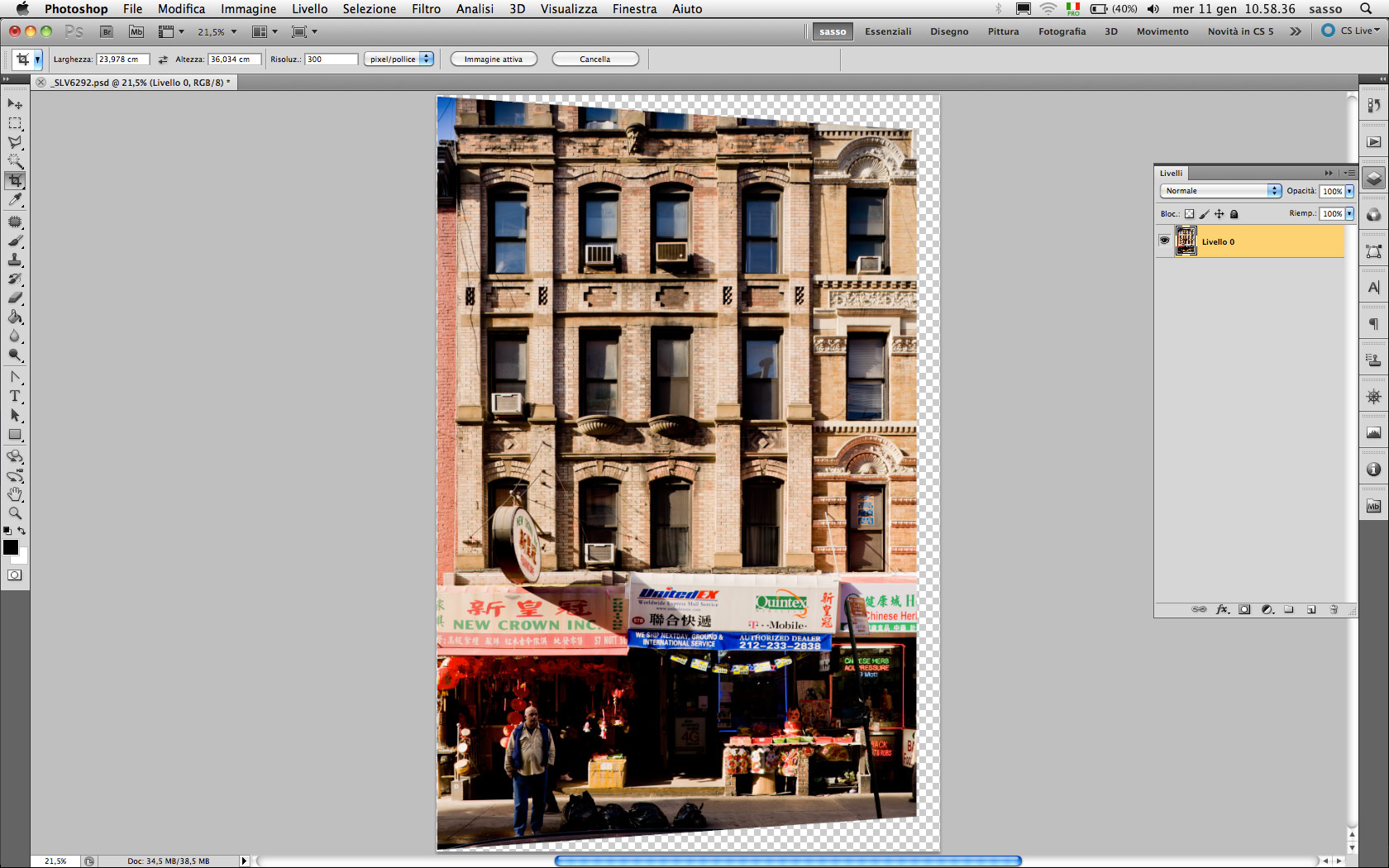 A questo punto non resta che "tirare" verso l'esterno uno dei due angoli attivi della cornice di trasformazione posti dalla parte dove la prospettiva ha ridotto le dimensioni dell'immagine del soggetto fino a ripristinare la forma corretta.
