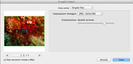 Siamo pronti ad inviare tramite E-mail l'immagine desiderata, ci basterà deciderne le dimensioni e ViewNX 2.3 farà tutto il resto. Dopo aver fatto click sul pulsante di invio E-mail, ViewNX ci permetterà di scegliere le dimensioni dell’immagine da spedire tramite questa schermata.