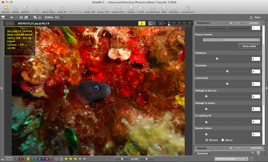 Nella confezione di vendita di COOLPIX S2600, oltre agli accessori indispensabili all’utilizzo della fotocamera, troviamo un CD-Rom contenente il software Nikon per gestire le nostre immagini digitali. Il software Nikon ViewNX 2.3 in accoppiata a Nikon Transfer 2 ci permetterà, infatti, di gestire il flusso di lavoro così da avere in poco tempo una scelta degli scatti appena effettuati. Nikon Transfer 2 ci consentirà di copiare le immagini direttamente dalla fotocamera, tramite cavo USB, oppure direttamente dalla SD-Card letta attraverso un lettore di card esterno. A fine immersione è stato, quindi, immediato importare le immagini salvate nella nostra SD-Card Lexar 133x professional SDHC da 8 GB in Nikon ViewNX 2. Ricordiamo che il software Nikon ViewNX2 comprensivo di Nikon Transfer 2 è scaricabile gratuitamente come aggiornamento o in ultima versione completa disponibile, dal Sito Nikon di Supporto Europeo.