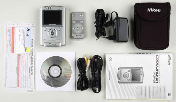 Il Coolwalker viene proposto da Nital in un kit molto ricco che comprende anche una custodia da viaggio, la batteria e l'alimentatore, i cavi per il collegamento al PC e al televisore, - con la possibilità di ascoltare tanto i commenti audio eventualmente associati a un'immagine che l'audio vero e proprio degli eventuali filmati eseguiti con una Coolpix o altre compatte -; oltre al manuale stampato in lingua inglese (la dotazione Nital include anche il manuale impaginato con testi ed immagini in lingua italiana fornito su CD in forma elettronica pdf) e ai driver per il collegamento del Coolwalker necessari solo per il collegamento ai sistemi operativi come Windows 98 SE. Collegato a sistemi operativi come XP viene naturalmente riconosciuto come HDD esterno senza dover caricare driver aggiuntivi.