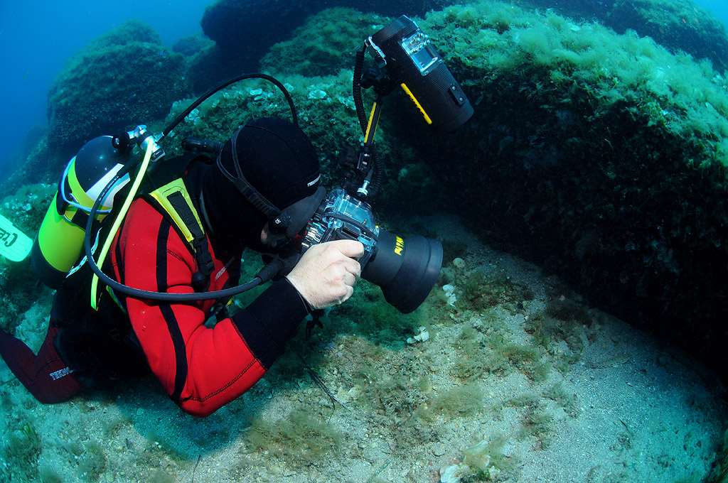 Ci troviamo nell'area di tutela biologica dello Scoglietto, pochi minuti di barca dalla darsena di Portoferraio. Per i primi test utilizzo come ottica lo zoom AF-S DX 18-105 mm ED VR. L'interesse è notevole, l'idea di poter utilizzare uno zoom con queste caratteristiche mi lascia un po' perplesso ma al contempo molto curioso. Nei primi metri di discesa controllo la funzionalità dei vari comandi: tutto regolare, pulsanti e leve funzionano a dovere, il braccetto del flash è di facile brandeggio e spostare la grossa custodia dell'SB-900 è alquanto agevole.