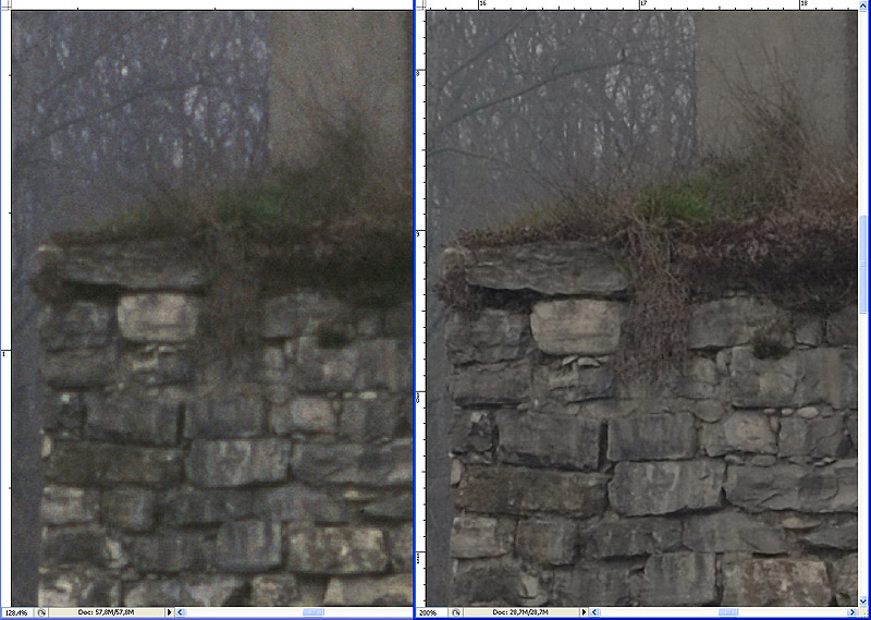 Infine faccio notare anche il perfetto lavoro effettuato dal software Nikon Capture NX per quanto concerne l'eliminazione dell'aberrazione di colore visibile nel raffronto qui sotto tra lo scatto a pellicola (a sinistra) e quello digitale (a destra) ad un ingrandimento rispettivamente del 500% e 700%!.