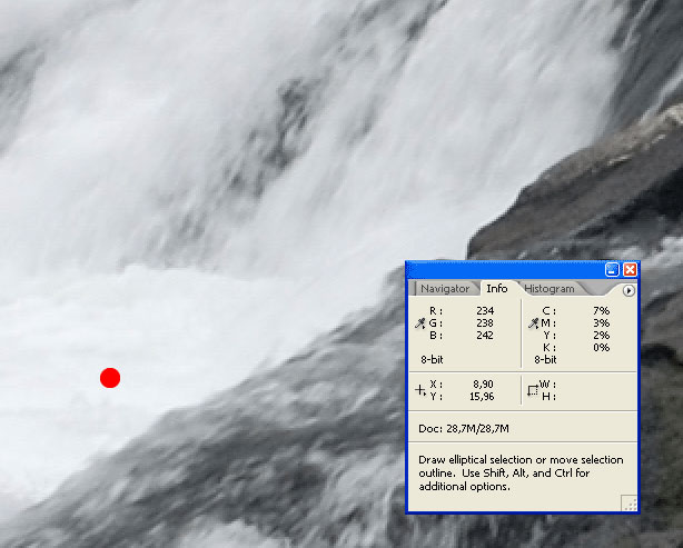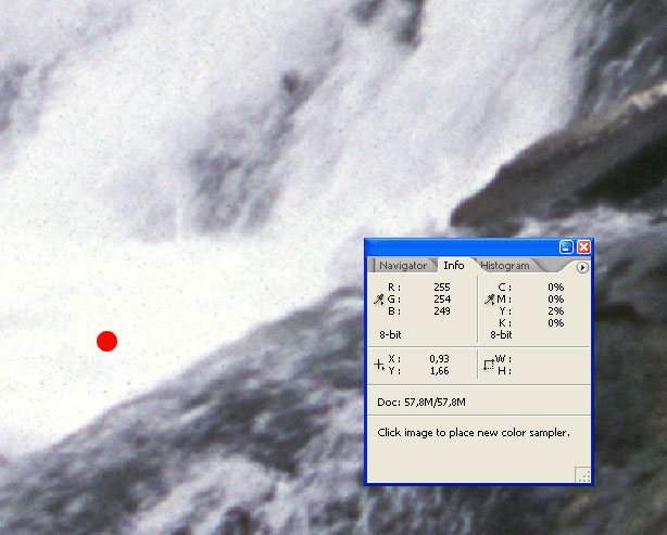 Per quanto concerne il dettaglio il digitale vince, almeno in queste condizioni di ripresa, ma forse la pellicola può dire ancora la sua in altri campi, come la latitudine di posa e la capacità di non bucare le alte luci. Per verificare questo aspetto ho selezionato una parte della cascata dell'Adda su cui ho preso i valori colore con il contagocce di Photoshop e la palette "Info". Il punto rosso indica la zona di lettura, scelta accuratamente tra le zone più luminose dell'immagine.