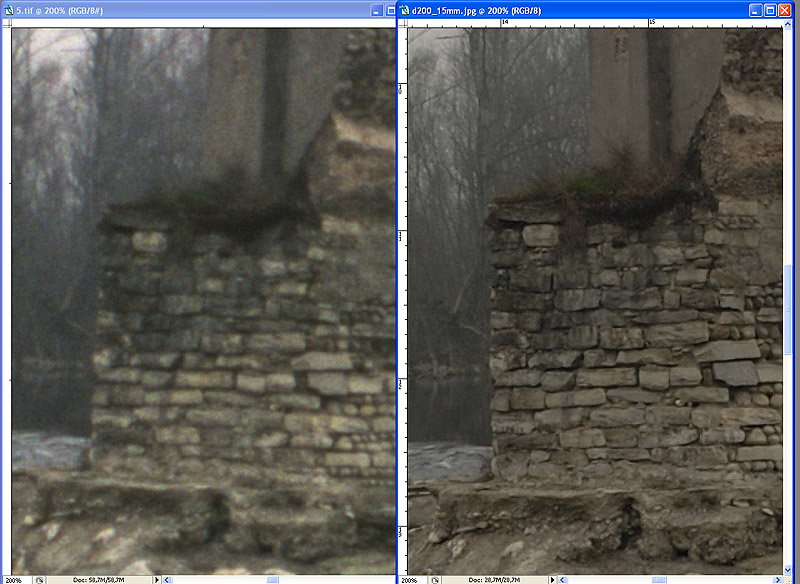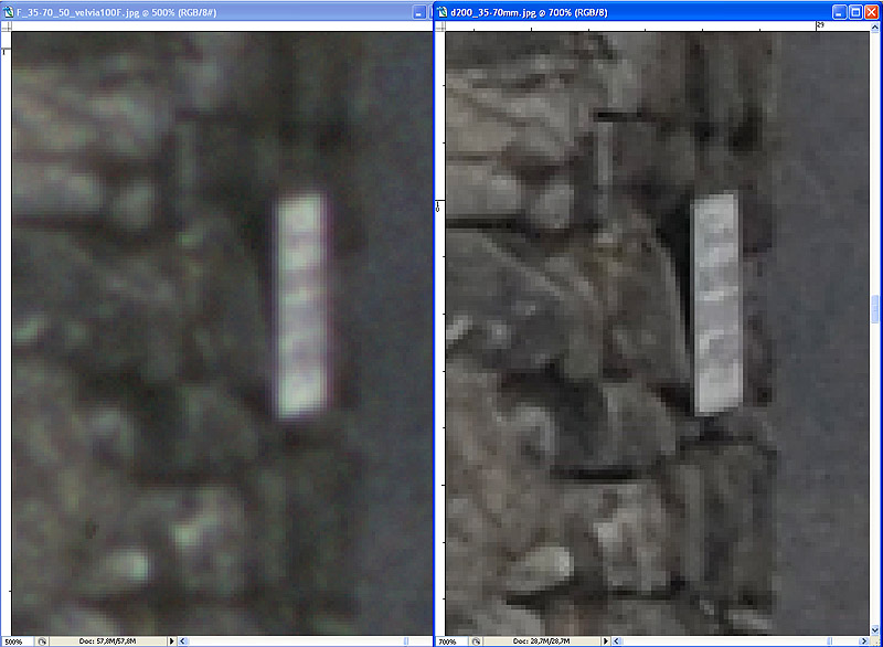 La prova si è svolta utilizzando lo zoom Nikon AF 35-70mm f/2.8 chiuso a f/8 utilizzato alla focale di 35mm sulla Nikon D200, mentre con la Nikon F sono state scattate due fotografie, la prima alla stessa focale e una seconda, modificando lo zoom affinché avesse la stessa copertura dell'immagine ripresa con la Nikon D200; la focale è stata di conseguenza aumentata fino a 50mm abbondanti.