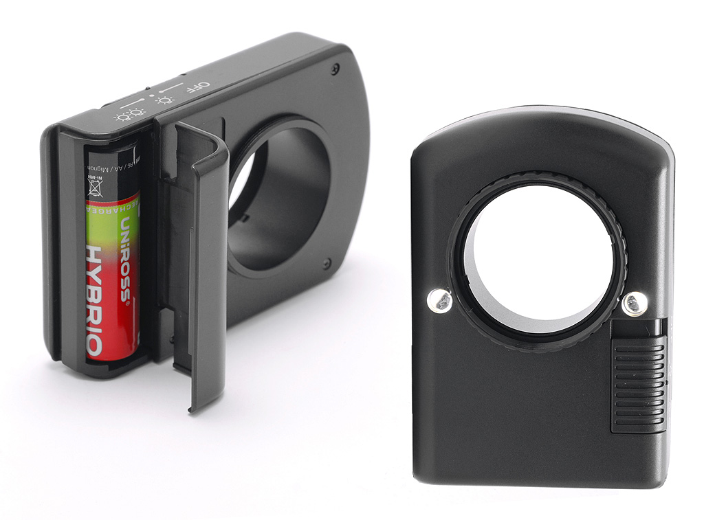 All'illuminazione provvedono due LED inseriti a fianco dell'obiettivo alimentati da due stilo AA – possono essere utilizzate anche le ricaricabili – che possono essere accesi sia singolarmente che in coppia. La focheggiatura si ottiene agendo su una doppia manopola micrometrica di regolazione che incorpora anche un blocco; l'escursione di fuoco è di 38mm. Il dimetro dell'area inquadrata nell'osservazione diretta è di 12 mm.