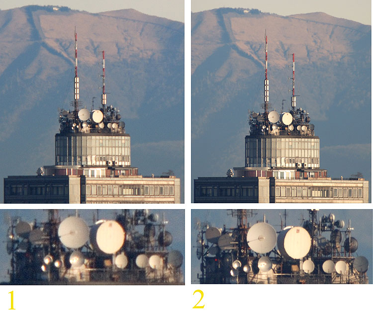 Nonostante il fatto che la foto n.1 è stata scattata con una focale equivalente da 900mm contro i 750 della seconda, quella scattata con il Nikkor Reflex, quest’ultima si difende comunque molto bene in termini fi risoluzione, pur lacsiando la vittoria al Fieldscope ED50 che, grazie al maggior ingradimento in rirpesa, permette comunque di risolvere qualche dettaglio in più, come le finestre dell’abitazione in cima alla montagna,
