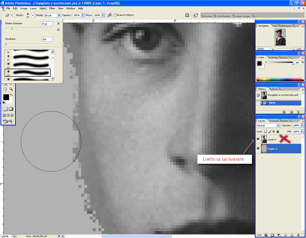 Adesso andiamo a posizionarci sul livello dell'immagine e con una gomma non troppo piccola e molto morbida, andiamo a cancellare tutte le parti che avanzano, cercando di essere il più vicino possibile, aiutandoci con lo zoom