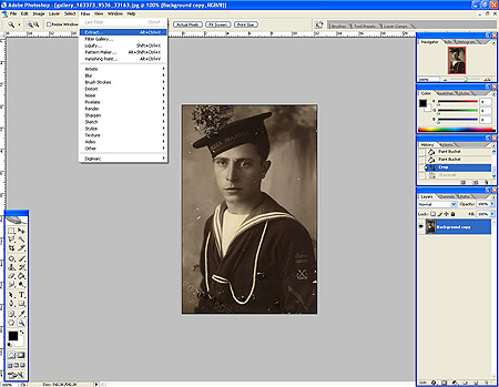 A questo punto dobbiamo fare 2 semplici operazioni per prima cosa convertiamo la foto in scala di grigi dall'apposito menu "image". E dopo creiamo un nuovo livello che riempiremo con una tinta non troppo scura.