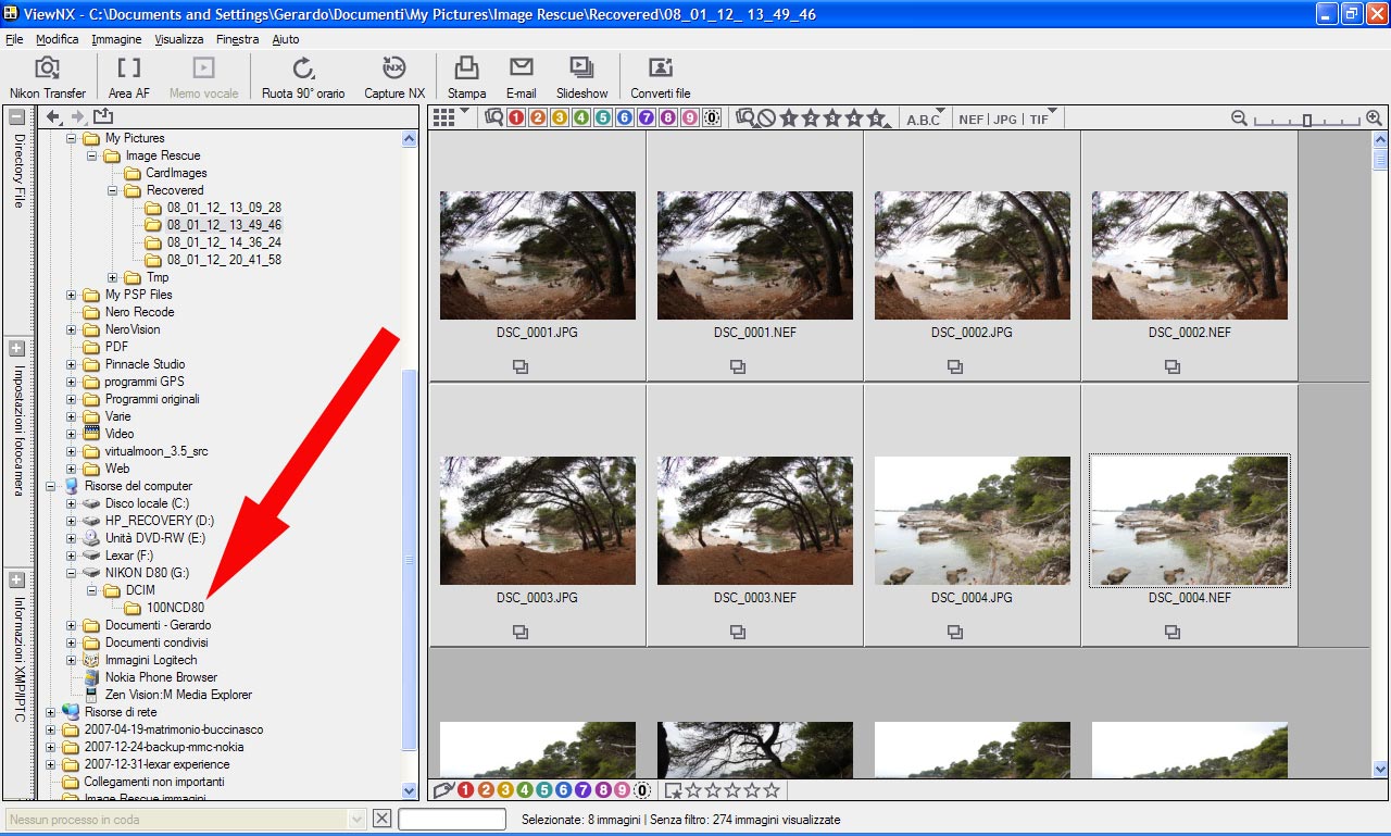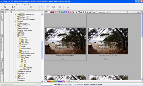 Apriamo la cartella contenente i file appena trasferiti dalla scheda in ViewNX. Sono presenti sia i NEF che i JPG.