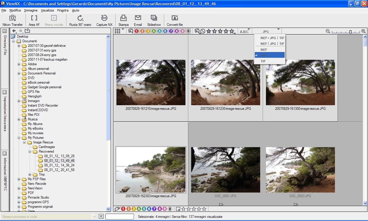 Selezionando la visualizzazione NEF|JPG|TIFF ecco che le coppie di file identici NEF+JPG vengono visualizzate distinte. I file sono stati quindi correttamente rinominati.