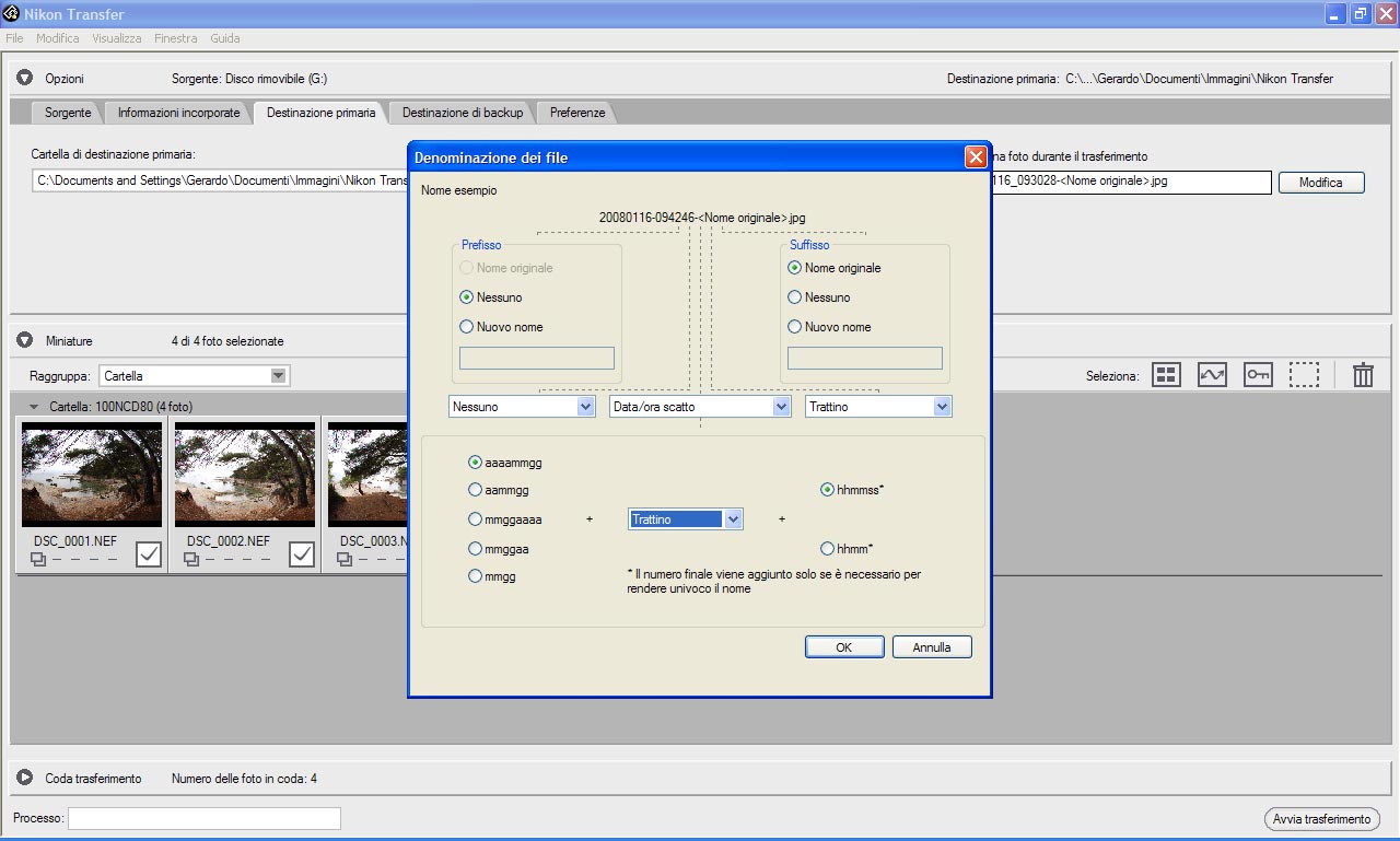 Si prepara la videata della denominazione file: qui è stato richiesto di utilizzare la data e l'ora di scatto seguita dal nome originale. Il nome originale dello scatto on-camera in realtà è andato perduto durante il recupero dei file da parte di Image Rescue e sostituito da un numero progressivo creato in ViewNX. È comunque un'informazione utile perché permette di valutare rapidamente che posto sequenziale occupava l'immagine nella scheda all'atto dello scatto originale.