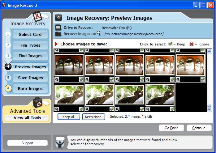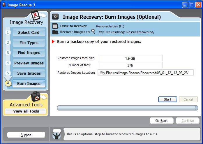Comando 6: Burn Images. Una volta salvate le immagini è possibile, volendo, procedere alla masterizzazione su CD o DVD della cartella con le immagini recuperate e salvate.