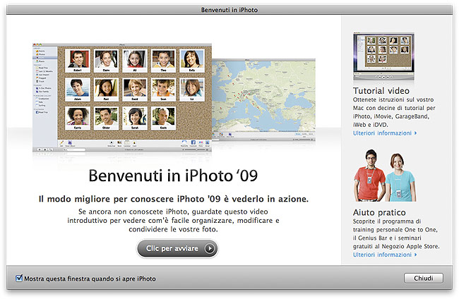 Al primo avvio iPhoto ci mostra una finestra Benvenuti in iPhoto che consente l'accesso ad alcuni tutorial on-line. Video-guide utili sia al novizio che all'utente esperto, illustrano in maniera chiara e veloce le principali novità della versione '09 e le caratteristiche salienti del programma stesso; questi tutorial sono disponibili nella sola lingua inglese.