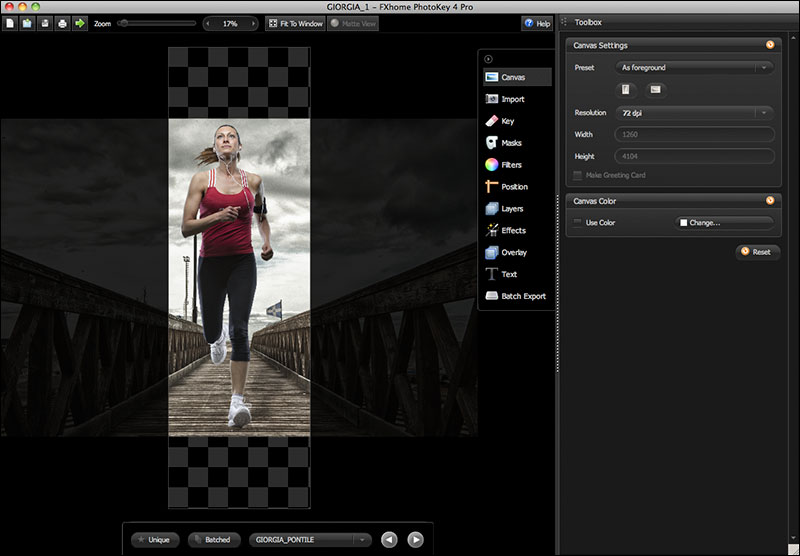 Adattiamo la dimensione dell'immagine definitiva rispetto a quella dello sfondo, selezionando la funzione “Canvas” e specificando il preset “As background”, disponibile nella palette laterale “Canvas Settings”.