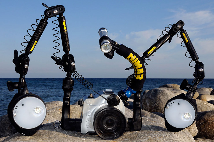 Nel nostro caso abbiamo utilizzato i braccetti in carbonio NiMAR che si sono dimostrati molto pratici ed efficaci. Proposti come accessori opzionali, sono muniti di un apposito connettore a slitta e, grazie alle clampe in dotazione, ci hanno permesso di brandeggiare correttamente i due flash INON Z240 type IV che abbiamo utilizzato durante le immersioni subacquee.