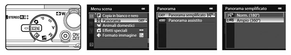 Si seleziona innanzitutto “Scene” dalla ghiera principale, e una volta entrati nel menù si sceglie tra la funzione Panorama Semplificato e Panorama assistito.