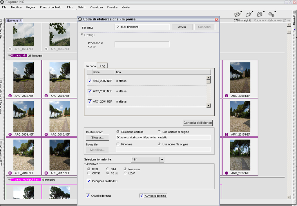 Quando facciamo una sessione di riprese panoramiche o a mosaico e scarichiamo i file nel computer, per prima cosa dovremo raggrupparli e dividerli nelle diverse sequenze (questo per semplificare la ricerca delle foto che compongono la singola panoramica per lo stitch). È in questa fase che già ci viene in aiuto Capture NX permettendoci, attraverso il suo Browser file, di etichettare e ordinare i diversi fotogrammi.