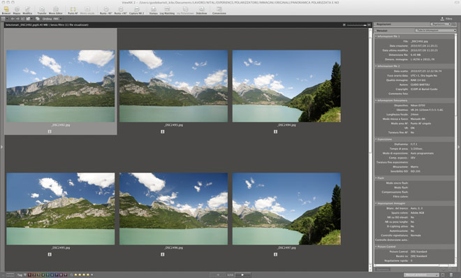 L'unica avvertenza è quella di controllare bene prima del montaggio in stitch che la luminosità del cielo non sia troppo diversa nelle diverse immagini. Nel caso dell'esempio seguente è stato necessario scurire leggermente l'inquadratura centrale e maggiormente quella laterale destra per uniformarle alla sinistra, scelta come riferimento per i colori molto saturi. Senza questa ottimizzazione si vedeva nella parte destra del cielo, nel punto di unione, una macchia data dal passaggio troppo repentino fra le due luminosità. Ciò non è stato necessario nell'unione delle immagini non polarizzate.