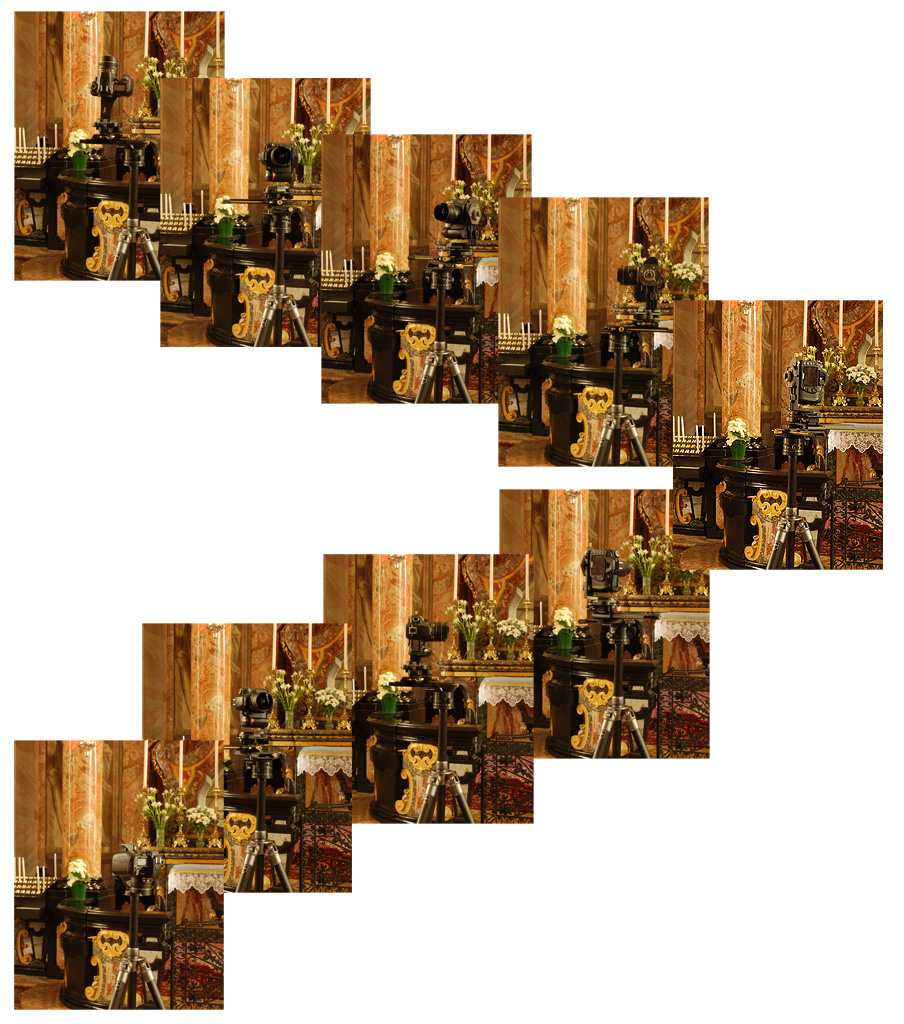 La testa a sua volta deve essere molto particolare: per questa experience è stata usata una Nikon D80 con obiettivo DX Fisheye 10,5mm unitamente a una testa 303 PLUS della Manfrotto: è dotata di due piastre incrociate a slitta micrometrica per il posizionamento preciso del punto nodale e di una staffa a "L" per poter eseguire la panoramica sia con inquadratura verticale che orizzontale.