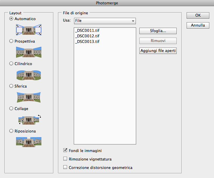 2. Aprire i tre TIF 16 bit in Photoshop quindi dal menu File/Automatizza, selezionare Photomerge