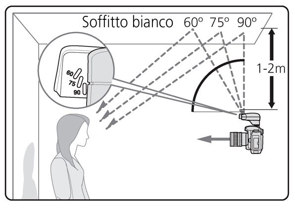 flash SB-400 orientato verso un soffitto bianco con le tre angolazioni possibili…