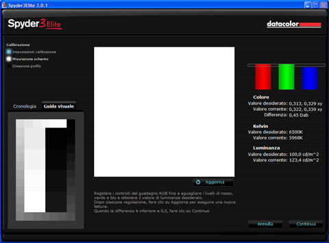 Avendo specificato dei valori "target" per nero e bianco, anche in questo caso il software ci guiderà a regolare i comandi del monitor per raggiungerli. Una volta confermato l'ottenimento di valori accettabili, la fase di calibrazione può dirsi conclusa e sul monitor cominceranno a comparire numerosi campioni di colore, immediatamente analizzati per generare il profilo colore del nostro monitor.