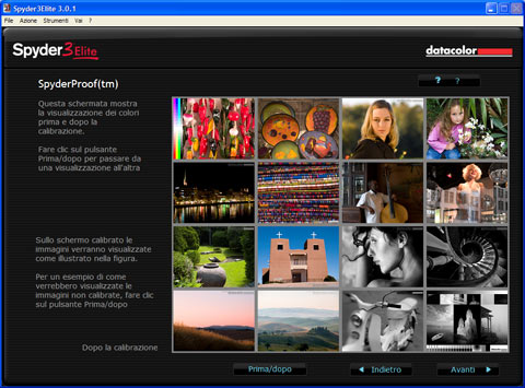 Mutuata dalle versioni precedenti, ma notevolmente potenziata, giungiamo alla funzione "SpyderProof". Agendo sul pulsante prima/dopo, in questa schermata abbiamo la possibilità di ammirare, è il caso di dirlo, il benefico effetto della calibrazione appena effettuata. Oltre alla visione d'insieme delle 16 immagini, abbiamo la possibilità di cliccare singolarmente su di esse per poterle visualizzare con dimensioni maggiori.