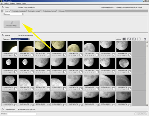 Qui chiediamo a Nikon Transfer di selezionare come sorgente un disco rimovibile